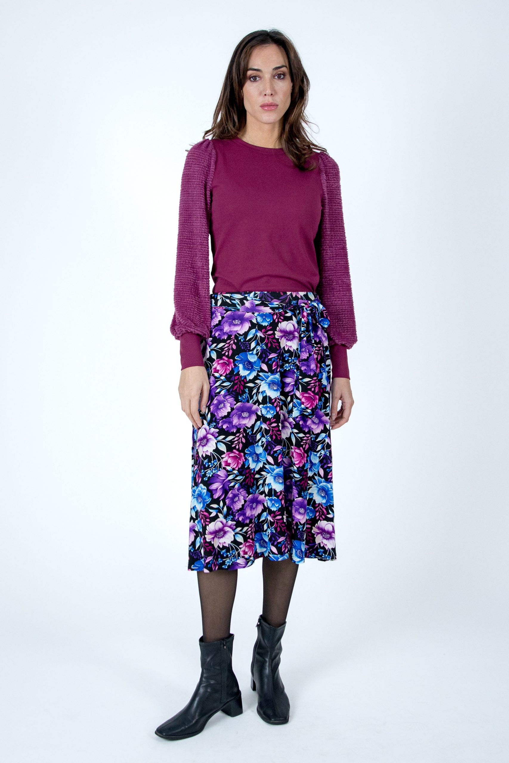 Camiseta en color púrpura combinada en dos tejidos uno liso en el cuerpo y otro con efecto pelito en las mangas.