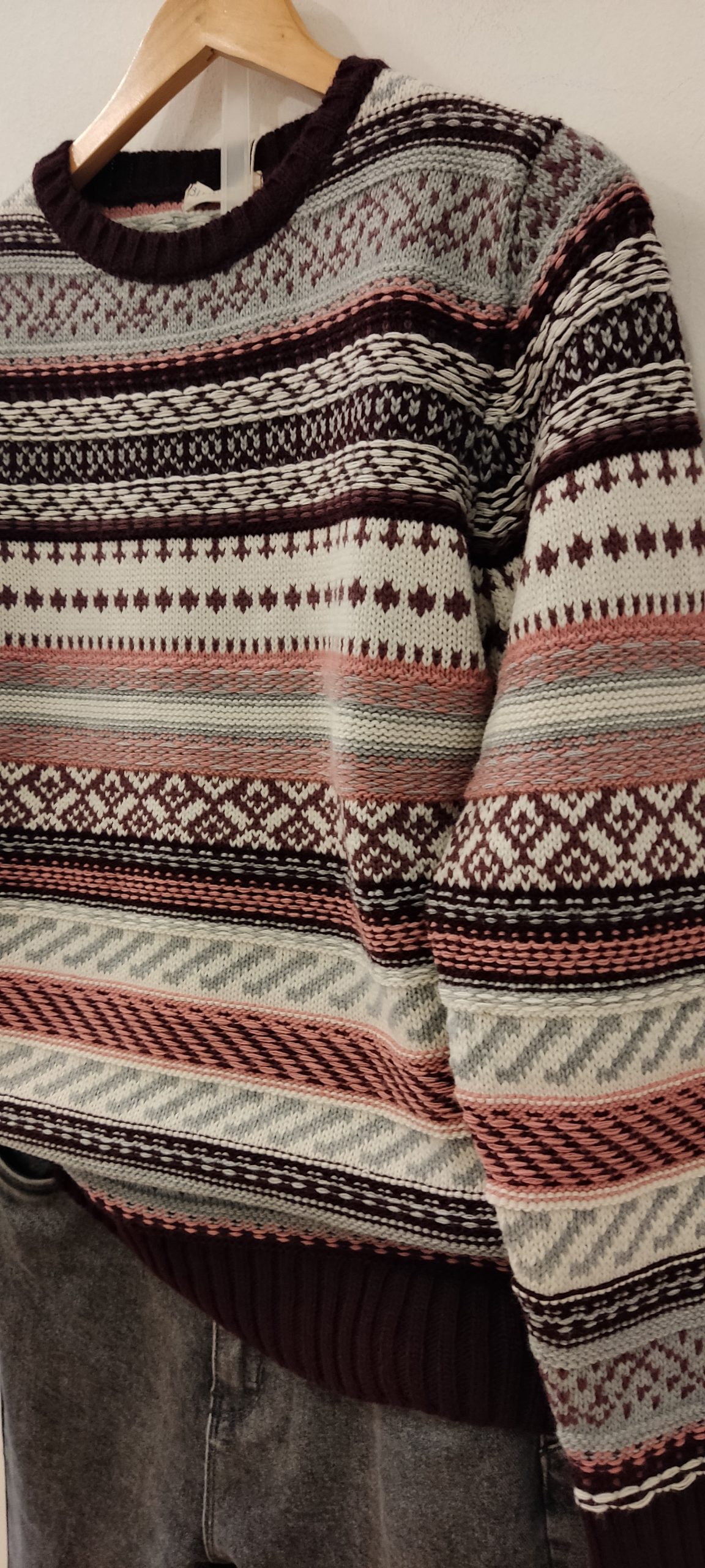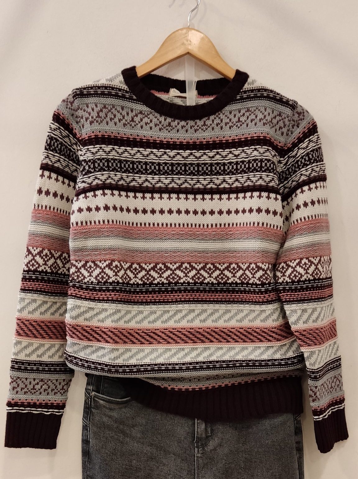 Jersey de punto con franjas en tonos blanco, gris y rosa.