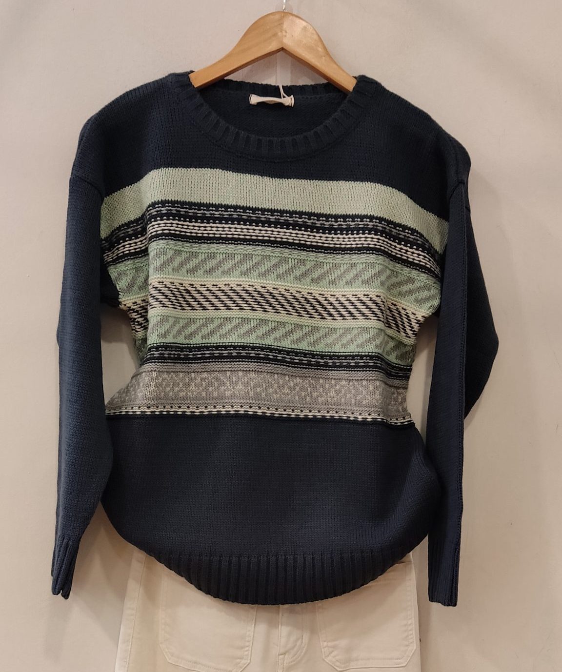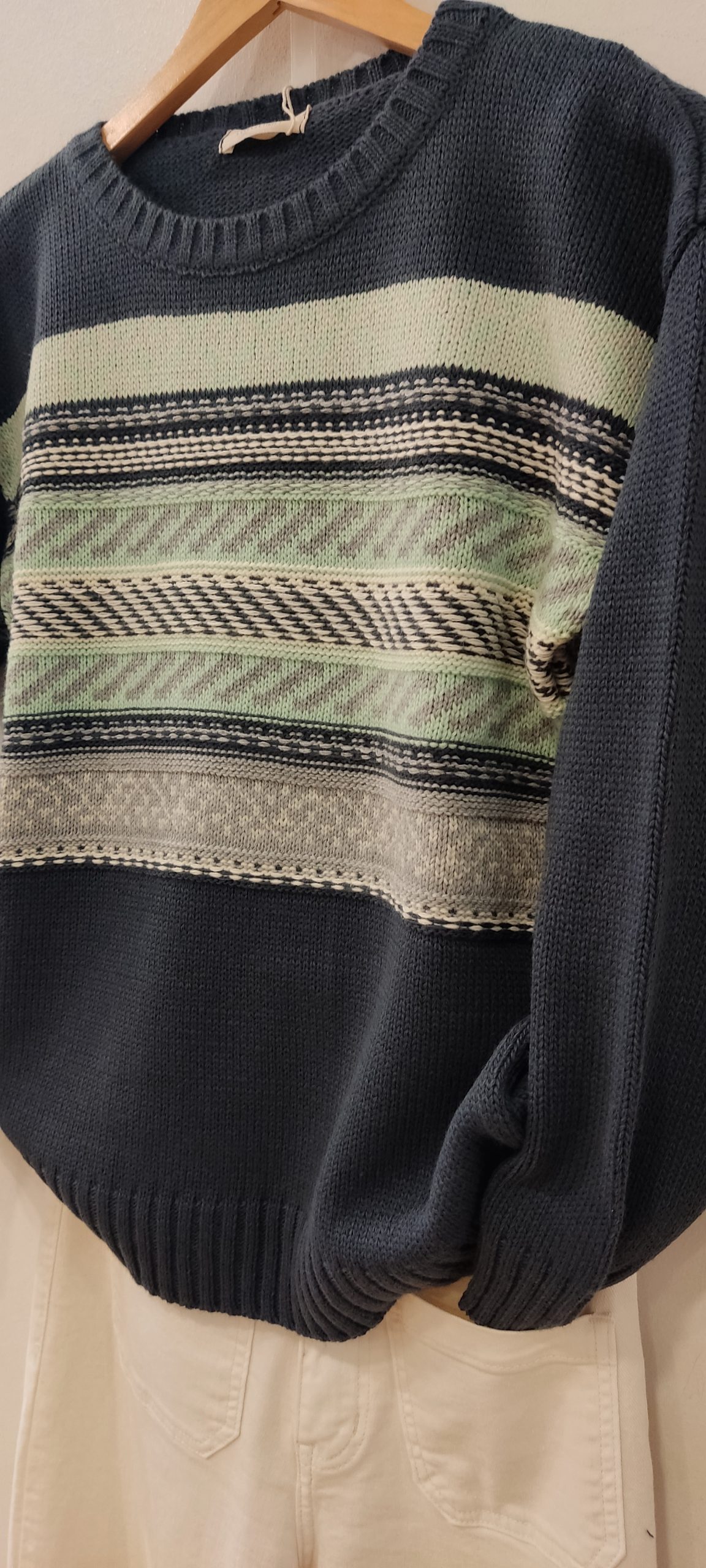 Jersey de punto en color azul con greca sobre pecho en tonos blanco, gris y verde agua.