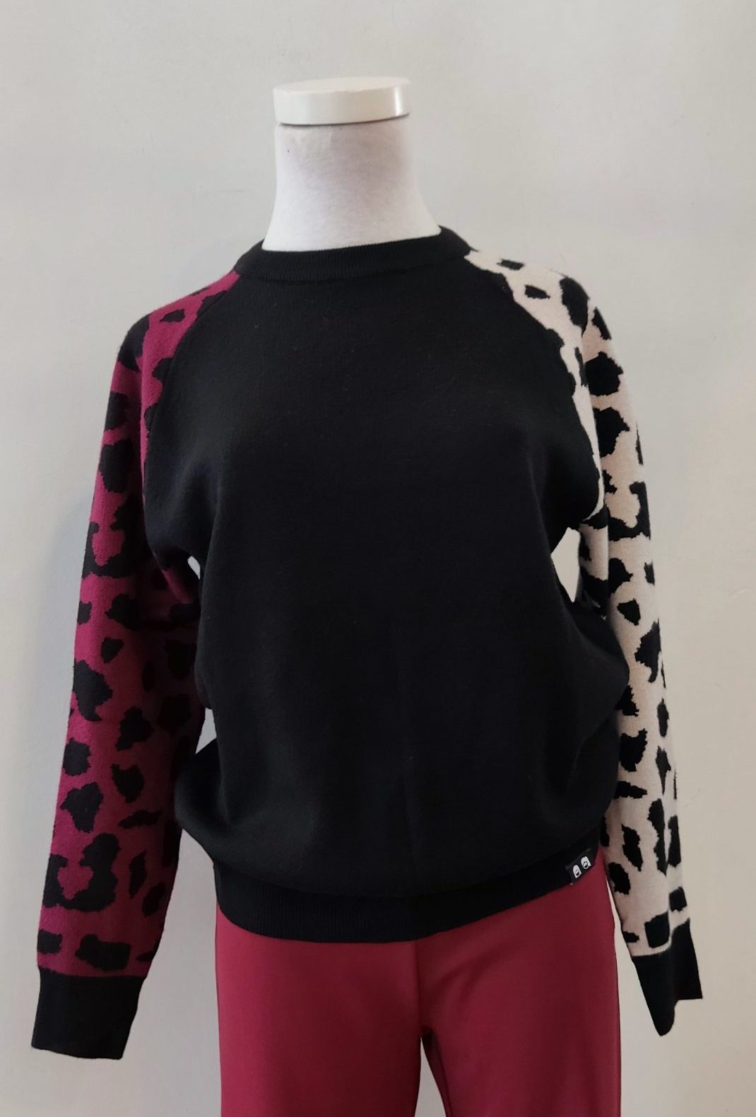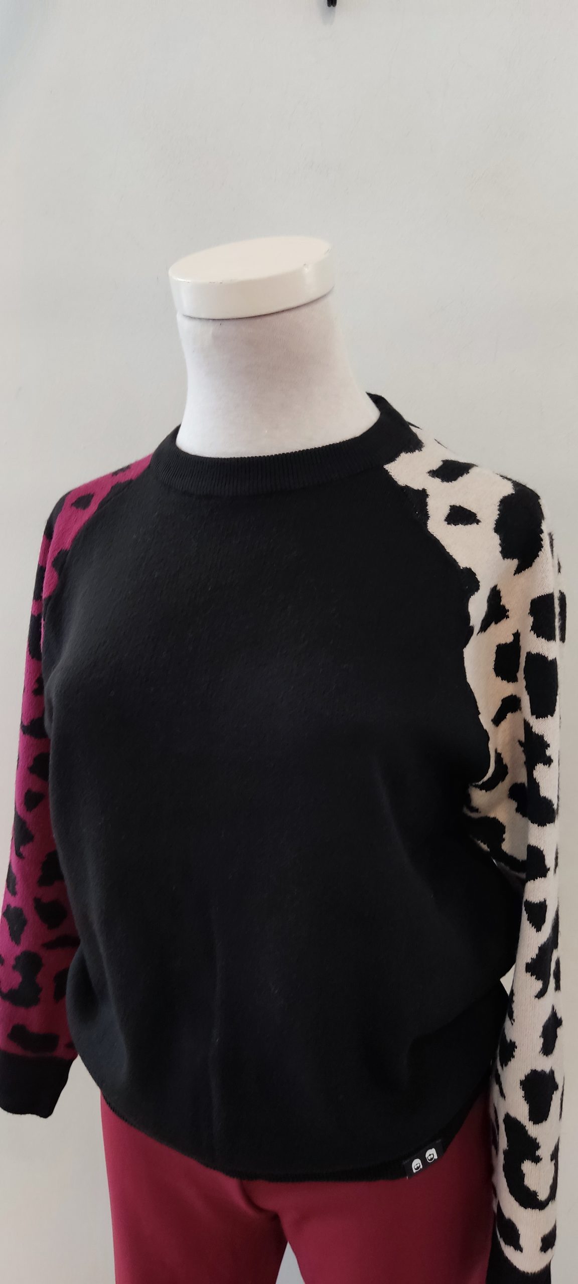 Jersey con cuerpo en color negro combinado con mangas con estampado animal en dos tonos.