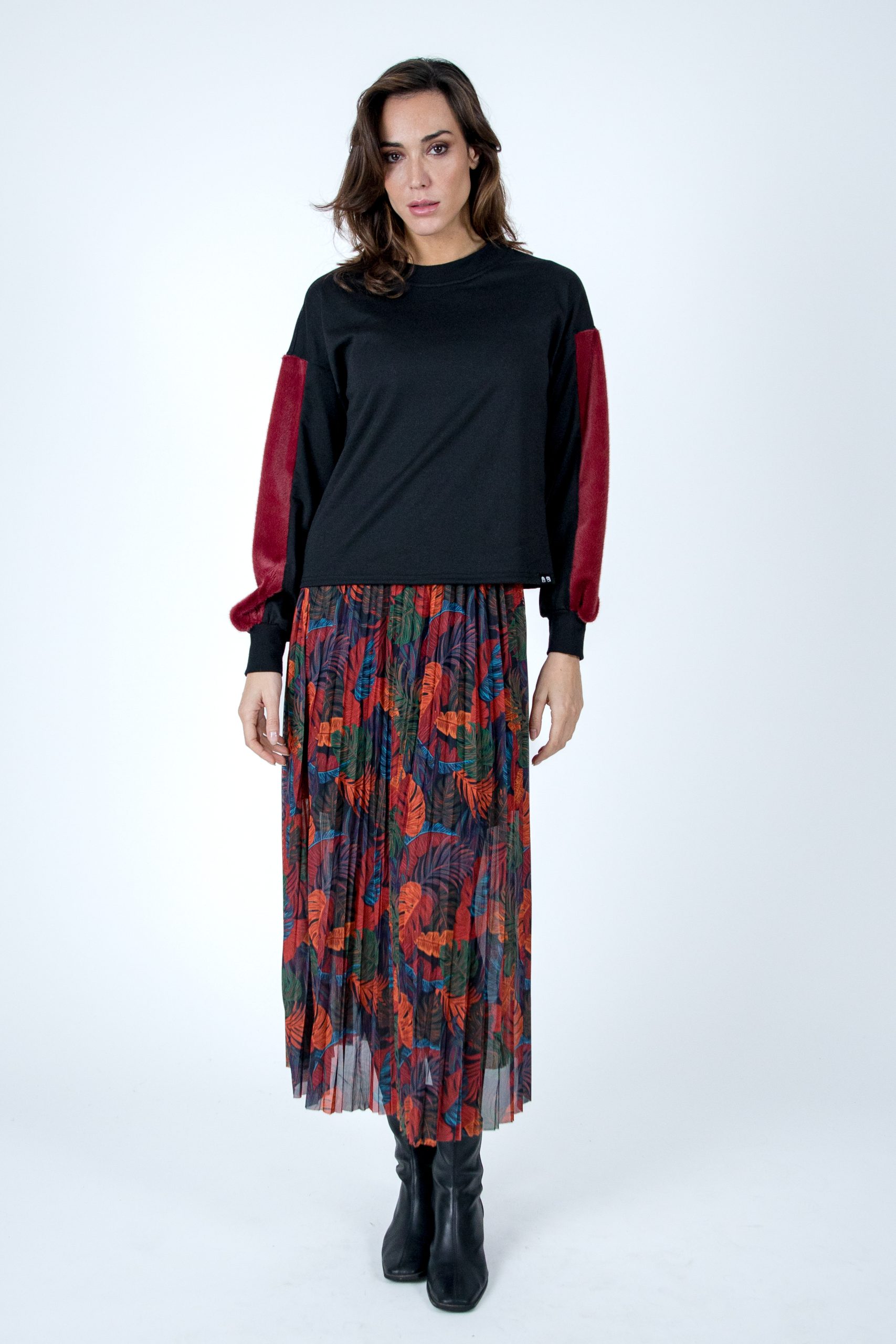 Sudadera liso con detalle en mangas en color rojo. Cuello a la caja. Corte suelto.