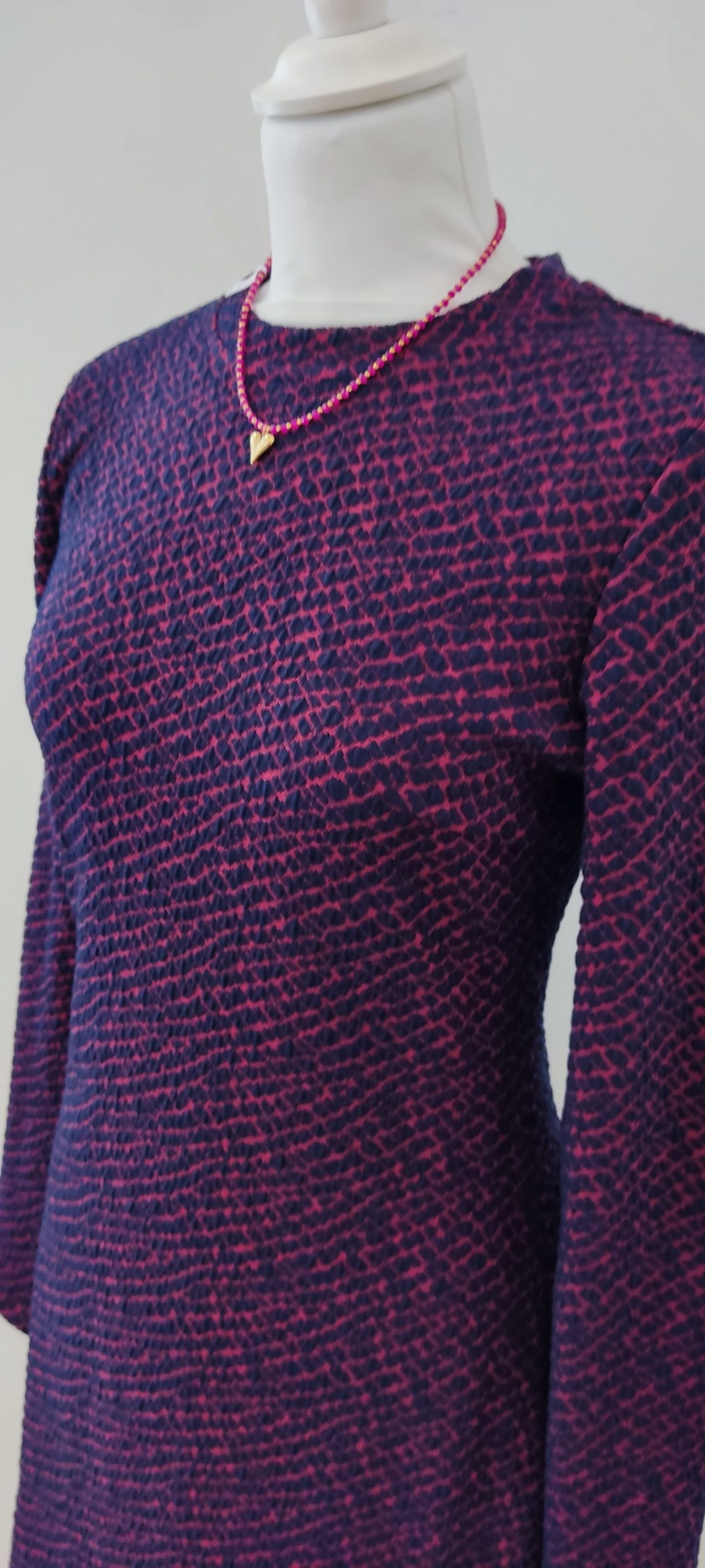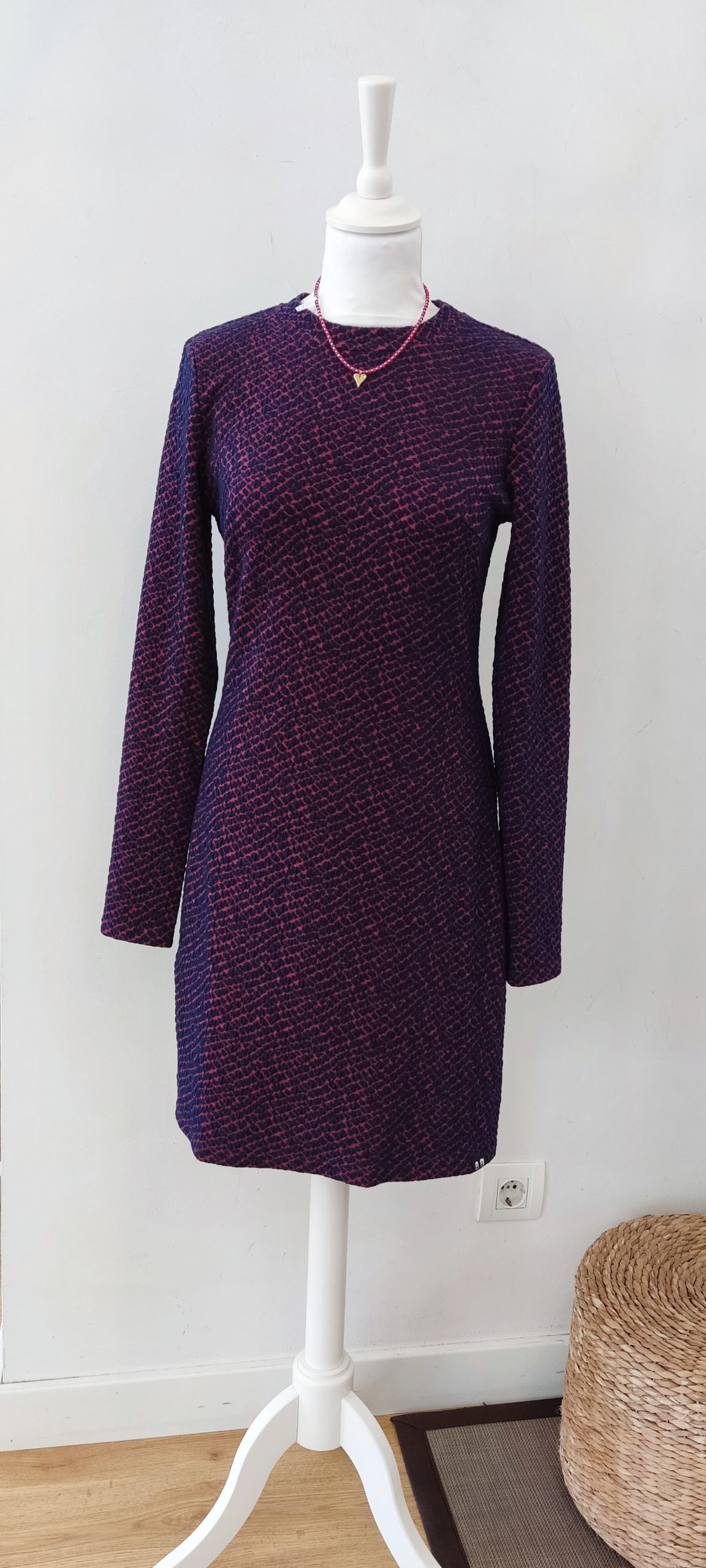 Vestido corto de tejido texturizado combinado cen color marino y púrpura.