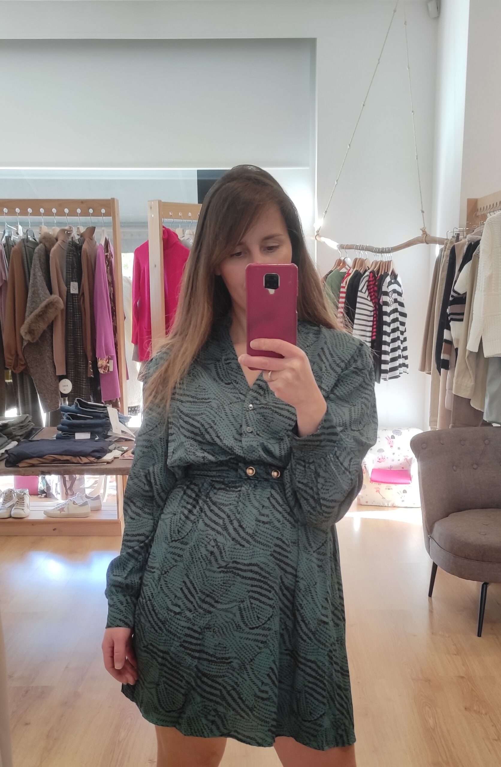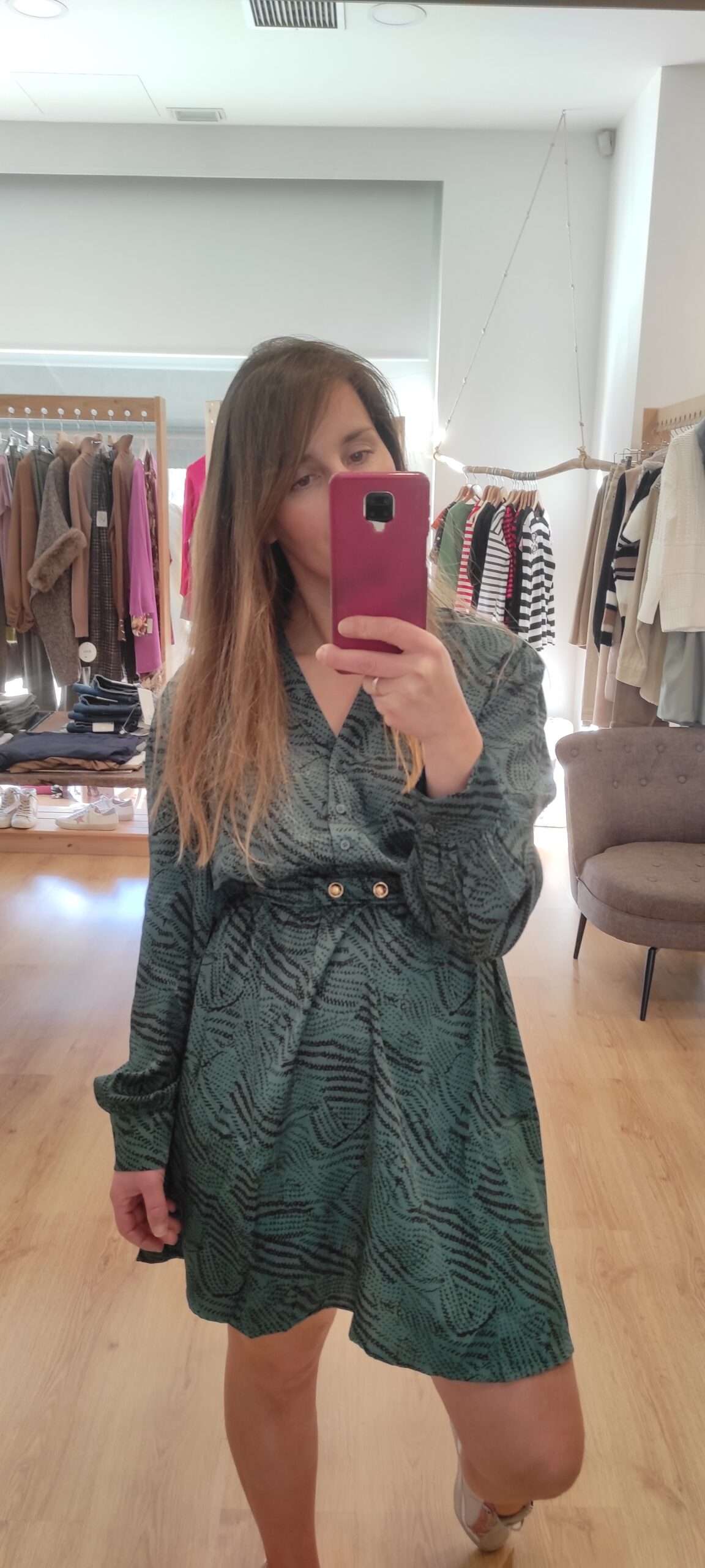 Vestido corto estampado combinado en tonos verde y negro, con botones dorados en la cintura.